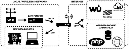 By adding the ATMOCOM device into the mix you can have real-time local storage of your weather data on your website,  web server or single board computer such as Raspberry PI. Thousands of weather stations that were previously restricted to uploading weather data only to commercial weather networks can now have the data stored and accessed locally, under full control of the owner.
